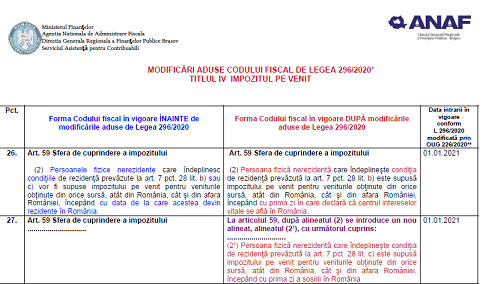 Va supunem atentiei un material oficial (33 pagini) – elaborat de DGRFP Brasov (institutie careia ii multumim pentru posibilitatea preluarii informatiilor) – ce prezinta sub forma de tabel comparativ, o serie de informatii cu privire la modificările aduse modificările aduse Codului fiscal de Legea 296/2020 – la Titlul IV „Impozitul pe venit” (material publicat în data de 11.01.2021).