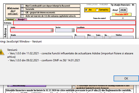 Pe site-ul oficial al ANAF a fost actualizat azi – 11.02.2021 – PDF-ul inteligent – S1002-S1003-S1005 Situaţii financiare anuale la 31 decembrie 2020 întocmite de către entităţile al căror exerciţiu financiar coincide cu anul calendaristic, prevăzute la pct. 1.1 din Anexa nr. 1 la Ordinul ministrului finanţelor publice nr. 58/14.01.2021 – privind principalele aspecte legate de întocmirea şi depunerea situaţiilor financiare anuale şi a raportărilor contabile anuale ale operatorilor economici la unităţile teritoriale ale Ministerului Finanţelor Publice, precum şi pentru modificarea şi completarea unor reglementări contabile.