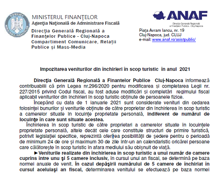 Va supunem atentiei un material oficial (2 pagini) – elaborat de DGRFP Cluj (institutie careia ii multumim pentru posibilitatea preluarii informatiilor) – ce prezinta o serie de informatii cu privire la impozitarea veniturilor din închirieri în scop turistic în anul 2021 (material publicat în luna februarie 2021).