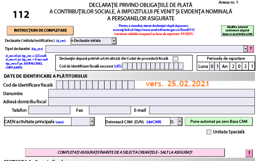 Pe site-ul oficial al ANAF a fost actualizat azi – 25.02.2021 – PDF-ul inteligent necesar pentru generarea – D112 – Declaraţia privind obligaţiile de plată a contribuţiilor sociale, impozitului pe venit şi evidenţa nominală a persoanelor asigurate – conform Ordinului comun nr. 203/207/188 al MFP/MMJS/MS din 02.2021, publicat în M.Of. 794/ 19.02.2021 , valabil începând cu luna de raportare 01/2021 .