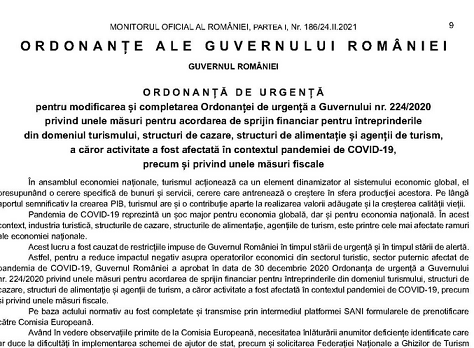 Multumita colegilor de pe grupuri, va informam ca, in Monitorul Oficial nr. 186 din 24 Februarie 2021, a fost publicata Ordonanța de Urgență a Guvernului României nr. 10 din 19 Februarie 2021 – pentru modificarea și completarea Ordonanței de urgență a Guvernului nr. 224/2020 privind unele măsuri pentru acordarea de sprijin financiar pentru întreprinderile din domeniul turismului, structuri de cazare, structuri de alimentație și agenții de turism, a căror activitate a fost afectată în contextul pandemiei de COVID-19, precum și privind unele măsuri fiscale.