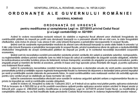 Stimati colegi, va informam pe aceasta cale ca, in Monitorul Oficial nr. 197 din 26 Februarie 2021, a fost publicata Ordonanță de Urgență a Guvernului României nr. 13 din 24 Februarie 2021 – pentru modificarea și completarea Legii nr. 227/2015 privind Codul fiscal și a Legii contabilității nr. 82/1991.