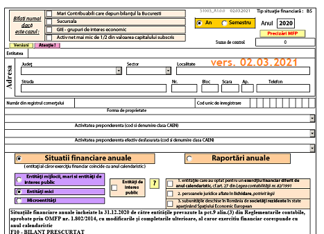 Pe site-ul oficial al ANAF a fost actualizat ieri – 02.03.2021 – PDF-ul inteligent – S1002-S1003-S1005 Situaţii financiare anuale la 31 decembrie 2020 întocmite de către entităţile al căror exerciţiu financiar coincide cu anul calendaristic, prevăzute la pct. 1.1 din Anexa nr. 1 la Ordinul ministrului finanţelor publice nr. 58/14.01.2021 – privind principalele aspecte legate de întocmirea şi depunerea situaţiilor financiare anuale şi a raportărilor contabile anuale ale operatorilor economici la unităţile teritoriale ale Ministerului Finanţelor Publice, precum şi pentru modificarea şi completarea unor reglementări contabile.
