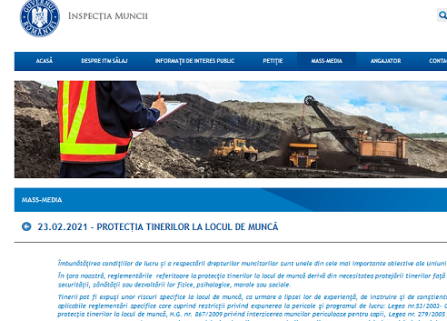 💡 Tinerii pot fi expuşi unor riscuri specifice la locul de muncă, ca urmare a lipsei lor de experienţă, de instruire şi de conştientizare. Pentru tinerii sub 18 ani sunt aplicabile reglementări specifice care cuprind restricţii privind expunerea la pericole şi programul de lucru: Legea nr.53/2003- Codul Muncii, H.G. nr. 600/2007 privind protecția tinerilor la locul de muncă, H.G. nr. 867/2009 privind interzicerea muncilor periculoase pentru copii, Legea nr. 279/2005 privind ucenicia la locul de muncă și H. G. nr. 855/2013 pentru aprobarea Normelor metodologice de aplicare a prevederilor Legii nr. 279/2005 privind ucenicia la locul de muncă.