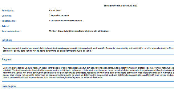 Prin urmare, venitul net anual obținut din străinătate de o persoană fizică autorizată, rezidentă în Romania, care desfășoară activități în mod independent atât în Romania cât și în străinătate, prevăzute în nomenclatorul activităților pentru care venitul net se poate determina pe baza normelor anuale de venit, se determină în sistem real, pe baza datelor din contabilitate, ca diferență între venitul brut și cheltuielile deductibile efectuate în scopul realizării de venituri, norma de venit fiind luată în considerare doar în cazul activităților desfășurate pe teritoriul Romaniei.