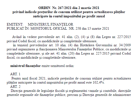 Stimati colegi, va informam pe aceasta cale ca, in Monitorul Oficial nr. 258 din 15 martie 2021, a fost publicat Ordinul ministrului finanțelor nr. 267 din 2 martie 2021 privind indicele preţurilor de consum utilizat pentru actualizarea plăţilor anticipate în contul impozitului pe profit anual.