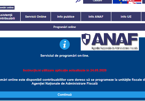 ANAF informeaza din nou, ca serviciul de programări online este disponibil contribuabililor care doresc să se programeze la unitățile fiscale din cadrul Agenției Naționale de Administrare Fiscală , iar acesta poate sa fie accesat de aici – click aici.