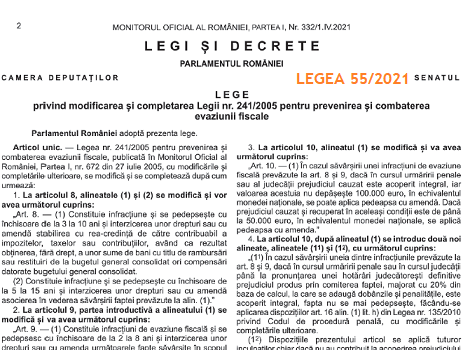 Stimati colegi, va informam pe aceasta cale ca, in Monitorul Oficial nr. 332 din 01.04.2021, a fost publicata Legea nr. 55 din 31 Martie 2021 (Emitent: Parlamentul României) – privind modificarea și completarea Legii nr. 241/2005 pentru prevenirea și combaterea evaziunii fiscale.