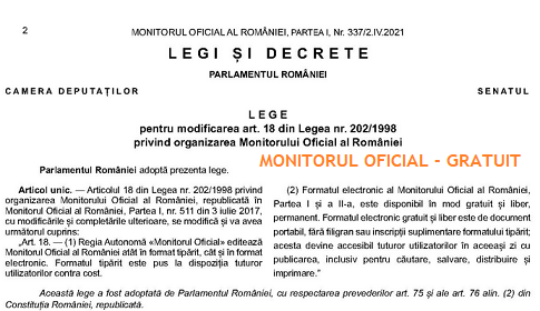 Stimati colegi, va informam pe aceasta cale ca, in Monitorul Oficial nr. 337 din 02 Aprilie 2021, a fost publicata Legea nr. 57 din 31 Martie 2021 (Emitent: Parlamentul României) – pentru modificarea art. 18 din Legea nr. 202/1998 privind organizarea Monitorului Oficial al României.