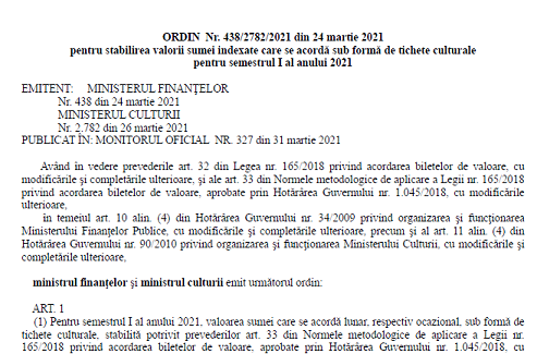 Va informam pe aceasta cale ca, in Monitorul Oficial nr. 327 din 31 martie 2021, a fost publicat Ordinul ministrului finanțelor nr. 438 din 24 martie 2021 – pentru stabilirea valorii sumei indexate care se acordă sub formă de tichete culturale pentru semestrul I al anului 2021.