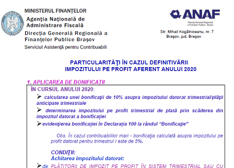 […] 🔍 Particularități in cazul definitivării impozitului pe profit aferent anului 2020 – material oficial ANAF (martie 2021) 🔍 – click aici […]