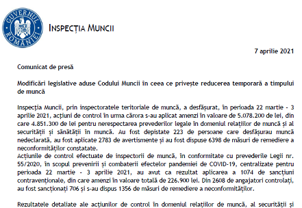 Inspecţia Muncii, prin inspectoratele teritoriale de muncă, a desfășurat, în perioada 22 martie – 3 aprilie 2021, acţiuni de control în urma cărora s-au aplicat amenzi în valoare de 5.078.200 de lei, din care 4.851.300 de lei pentru nerespectarea prevederilor legale în domeniul relațiilor de muncă și al securității și sănătății în muncă.