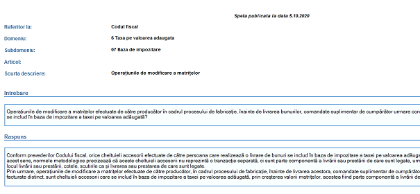 Intrebare - Operațiunile de modificare a matrițelor efectuate de către producător în cadrul procesului de fabricație, înainte de livrarea bunurilor, comandate suplimentar de cumpărător urmare constatării unor erori de proiectare și facturate distinct, se includ în baza de impozitare a taxei pe valoarea adăugată? Raspuns Conform...Operațiunile de modificare a matrițelor - speță oficială ANAF (trim. 4 - 2020)