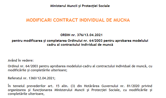Potrivit proiectului – se modifică şi se completează modelul-cadru al contractului individual de muncă, prevăzut în anexa la Ordinul ministrului muncii şi solidarității sociale nr. 64/2003, publicat în Monitorul Oficial al României, Partea I, nr. 139 din 4 martie 2003, cu modificările ulterioare, după cum urmează: