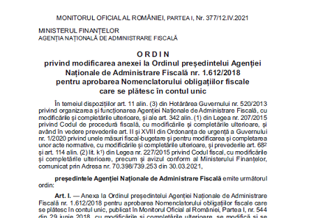 Va informam pe aceasta cale ca, in Monitorul Oficial nr. 377 din 12 Aprilie 2021, a fost publicat Ordinul Presedintelui Agenției Naționale de Administrare Fiscală nr. 551 din 07 Aprilie 2021 – privind modificarea anexei la Ordinul președintelui Agenției Naționale de Administrare Fiscală nr. 1.612/2018 pentru aprobarea Nomenclatorului obligațiilor fiscale care se plătesc în contul unic.