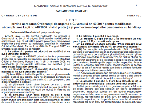 Cu intarziere, va informam ca, in Monitorul Oficial nr. 384 din 13 Aprilie 2021, a fost publicata Legea nr. 81 din 12 Aprilie 2021 (Emitent: Parlamentul României) – privind aprobarea Ordonanței de urgență a Guvernului nr. 60/2017 pentru modificarea și completarea Legii nr. 448/2006 privind protecția și promovarea drepturilor persoanelor cu handicap.