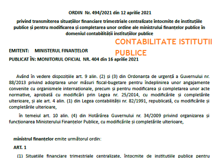 Cu intarziere, va informam ca, in Monitorul Oficial nr. 404 din 16 Aprilie 2021, a fost publicat ORDINUL MINISTERULUI FINANŢELOR Nr. 494/2021 din 12 aprilie 2021 – privind transmiterea situaţiilor financiare trimestriale centralizate întocmite de instituţiile publice şi pentru modificarea şi completarea unor ordine ale ministrului finanţelor publice în domeniul contabilităţii instituţiilor publice.
