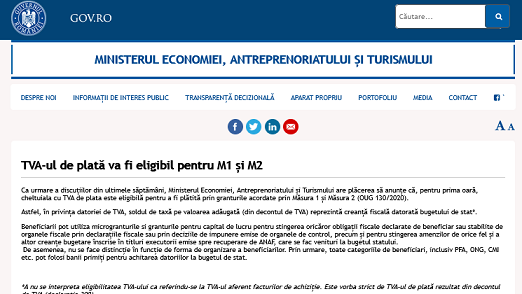 Ca urmare a discuțiilor din ultimele săptămâni, Ministerul Economiei, Antreprenoriatului și Turismului are plăcerea să anunțe că, pentru prima oară, cheltuiala cu TVA de plata este eligibilă pentru a fi plătită prin granturile acordate prin Măsura 1 și Măsura 2 (OUG 130/2020).