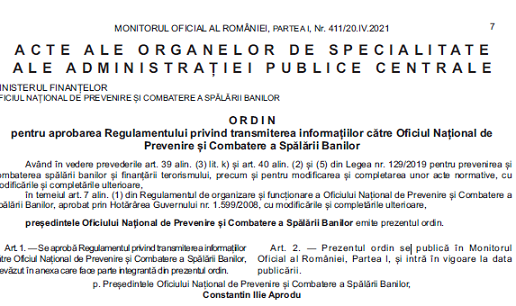 Va informam pe aceasta cale ca, in MONITORUL OFICIAL AL ROMÂNIEI, PARTEA I, Nr. 411/20.04.2021, a fost publicat Ordinul Oficiului Național de Prevenire și Combatere a Spălării Banilor nr. 79/12.04.2021 – pentru aprobarea Regulamentului privind transmiterea informațiilor către Oficiul Național de Prevenire și Combatere a Spălării Banilor.