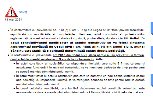 – În cazul celorlalte modificări, care implică depunerea actului constitutiv actualizat, este recomandat ca durata mandatului administratorului să fie modificată potrivit celor de mai sus.