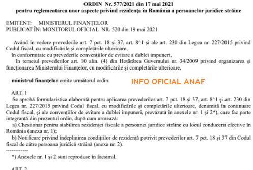 Dupa cum stiti, in Monitorul Oficial nr. 520 din 19 mai 2021, a fost publicat Ordinul ministrului finanțelor nr. 577 din 17 mai 2021 – pentru reglementarea unor aspecte privind rezidenţa în România a persoanelor juridice străine.