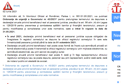 ONRC informeaza că, în Monitorul Oficial al României, Partea I, nr. 561/31.05.2021, s-a publicat Ordonanța de urgență a Guvernului nr. 43/2021 – TEXT INTEGRAL AICI – pentru prelungirea termenului de depunere a declaraţiei anuale privind beneficiarul real al persoanei juridice, prevăzut la art. 56 alin. (4) din Legea nr. 129/2019 pentru prevenirea şi combaterea spălării banilor şi finanţării terorismului, precum şi pentru modificarea şi completarea unor acte normative, care a intrat în vigoare la data de 31.05.2021.
