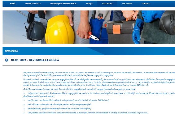 În acest context, ITM reaminteste tuturor angajatorilor că au obligația permanentă, de a lua măsuri cu privire la securitatea și sănătatea în muncă a angajaților, de a asigura locuri de muncă sănătoase, o instruire corespunzătoare domeniului de activitate, de a acorda echipamente de lucru și de protecție, materiale igienico-sanitare, fiind evitate astfel îmbolnăvirile profesionale, producerea de accidente și nu în ultimul rând răspândirea îmbolnăvirilor cu virusul SARS-Cov -2.