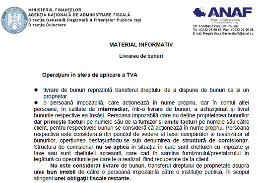 Va supunem atentiei un material oficial (2 pagini) – elaborat de DGRFP Iasi (institutie careia ii multumim pentru posibilitatea preluarii informatiilor) – ce prezinta o serie de informatii cu privire la livrarea de bunuri: