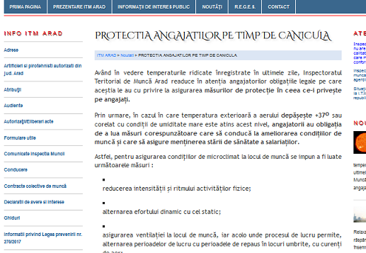 Având în vedere temperaturile ridicate înregistrate în ultimele zile, Inspectoratele Teritoriale de Muncă readuc în atenția angajatorilor obligațiile legale pe care aceștia le au cu privire la asigurarea măsurilor de protecție în ceea ce-i privește pe angajați. Prin urmare, în cazul în care temperatura exterioară...ITM (oficial - iunie 2021) - precizări cu privire la protecția angajaților pe timp de caniculă, dar si posibile controale