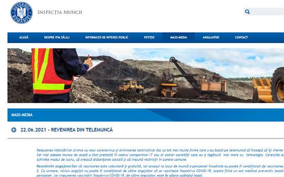 Astfel, ITM reaminteste angajatorilor că vaccinarea este votuntară și gratuită, iar accesul la locul de muncă a persoanei încadrate nu poate fi condiționat de vaccinarea împotriva Sars-Cov-2. Ca urmare, niciun angajat nu poate fi condiționat de către angajator să se vaccineze împotriva COVID-19, acesta fiind un act medical preventiv bazat pe consimțământul persoanei, iar impunerea vaccinării împotriva COVID-19, de către angajator, este în afara cadrului legal.