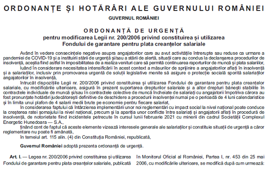 Stimati colegi, cu intarziere, va informam pe aceasta cale ca, in Monitorul Oficial nr. 615 din 22 Iunie 2021, a fost publicata Ordonanța de urgență a Guvernului nr. 53 din 16 Iunie 2021 – pentru modificarea Legii nr. 200/2006 privind constituirea și utilizarea Fondului de garantare pentru plata creanțelor salariale.
