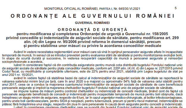 Stimati colegi, va informam cu intarziere ca, in Monitorul Oficial nr. 645 din 30 iunie 2021, a fost publicata – Ordonanta de Urgenta nr. 74/30.06.2021 – pentru modificarea și completarea Ordonanței de urgență a Guvernului nr. 158/2005 privind concediile și indemnizațiile de asigurări sociale de sănătate, pentru modificarea art. 299 alin. (4) din Legea nr. 95/2006 privind reforma în domeniul sănătății, precum și pentru stabilirea unor măsuri cu privire la acordarea concediilor medicale.