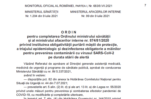 Cu intarziere va informam ca, in Monitorul Oficial nr. 683 din 09 Iulie 2021, a fost publicat Ordinul Ministerului Sănătății nr. 1204 din 09 Iulie 2021 – pentru completarea Ordinului ministrului sănătății și al ministrului afacerilor interne nr. 874/81/2020 privind instituirea obligativității purtării măștii de protecție, a triajului epidemiologic și dezinfectarea obligatorie a mâinilor pentru prevenirea contaminării cu virusul SARS-CoV-2 pe durata stării de alertă.