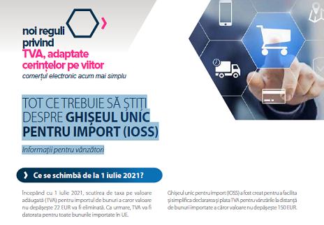 Stimati colegi, va supunem atentiei un material grafic oficial (2 pagini) – elaborat de AJFP Dambovita (institutie careia ii multumim pentru posibilitatea preluarii informatiilor) – ce prezinta o serie de informatii cu privire la TOT CE TREBUIE SĂ ȘTIȚI DESPRE GHIȘEUL UNIC PENTRU IMPORT (IOSS) – respectiv un info util pentru vanzatori – material publicat in data de 14.07.2021.