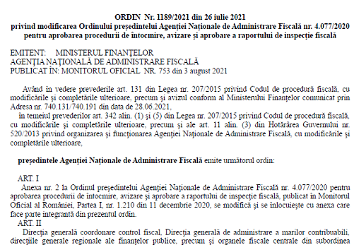 Stimati colegi, va informam cu intarziere ca, in Monitorul Oficial nr. 753 din 3 august 2021, a fost publicat – Ordinul președintelui ANAF nr. 1189 din 26 iulie 2021 – privind modificarea Ordinului preşedintelui Agenţiei Naţionale de Administrare Fiscală nr. 4.077/2020 pentru aprobarea procedurii de întocmire, avizare şi aprobare a raportului de inspecţie fiscală.