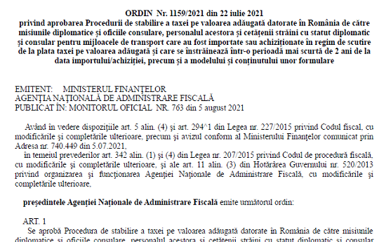 Stimati colegi, va informam cu intarziere ca, in Monitorul Oficial nr. 763 din 5 august 2021, a fost publicat – Ordinul președintelui ANAF nr. 1159 din 22 iulie 2021 – privind aprobarea Procedurii de stabilire a taxei pe valoarea adăugată datorate în România de către misiunile diplomatice şi oficiile consulare, personalul acestora şi cetăţenii străini cu statut diplomatic şi consular pentru mijloacele de transport care au fost importate sau achiziţionate în regim de scutire de la plata taxei pe valoarea adăugată şi care se înstrăinează într-o perioadă mai scurtă de 2 ani de la data importului/achiziţiei, precum şi a modelului şi conţinutului unor formulare.
