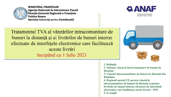 Va supunem atentiei un material oficial (9 pagini) – elaborat de DGRFP Brasov (institutie careia ii multumim pentru posibilitatea preluarii informatiilor) – ce prezinta cateva informatii utile (valabile începand cu 1 iulie 2021), cu privire la Tratamentul TVA al vânzărilor intracomunitare de bunuri la distanță și a livrărilor de bunuri interne efectuate de interfețele electronice care facilitează aceste livrări (material publicat în data de 21.07.2021).