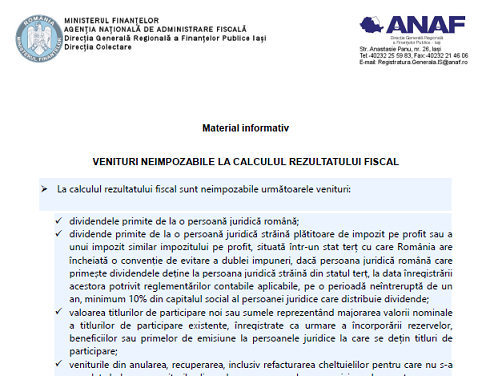 Va supunem atentiei un material oficial (4 pagini) – elaborat de DGRFP Iasi (institutie careia ii multumim pentru posibilitatea preluarii informatiilor) – ce prezinta o serie de informatii cu privire la VENITURILE NEIMPOZABILE LA CALCULUL REZULTATULUI FISCAL – material publicat in data de 21.07.2021.