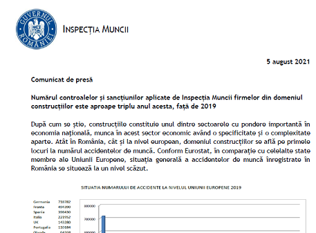 După cum se știe, construcțiile constituie unul dintre sectoarele cu pondere importantă în economia naţională, munca în acest sector economic având o specificitate și o complexitate aparte. Atât în România, cât și la nivel european, domeniul construcțiilor se află pe primele locuri la numărul accidentelor de muncă. Conform Eurostat, în comparație cu celelalte state membre ale Uniunii Europene, situația generală a accidentelor de muncă înregistrate în România se situează la un nivel scăzut.