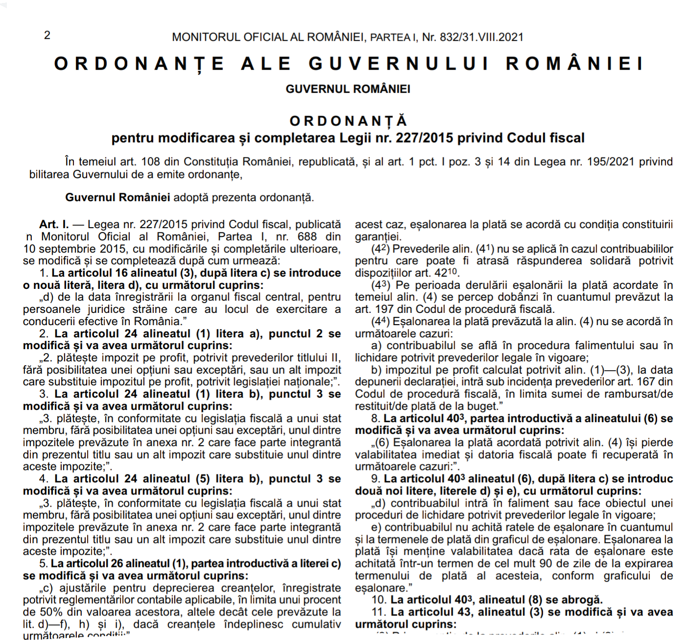 Stimati colegi, va informam ca, in Monitorul Oficial nr. 832 din 31 august 2021, au fost publicate – Ordonanța Guvernului Romaniei nr. 8 din 30 august 2021 – pentru modificarea și completarea Legii nr. 227/2015 privind Codul fiscal, dar si Ordonanța Guvernului Romaniei nr. 11 din 30 august 2021 – pentru modificarea și completarea Legii nr. 207/2015 privind Codul de procedură fiscală și reglementarea unor măsuri fiscale.