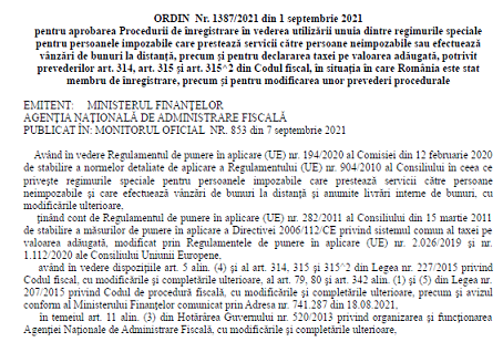 Stimati colegi, va informam pe aceasta cale ca, in Monitorul Oficial nr. 853 din 7 septembrie 2021, a fost publicat Ordinul președintelui ANAF nr. 1387 din 1 septembrie 2021 – pentru aprobarea Procedurii de înregistrare în vederea utilizării unuia dintre regimurile speciale pentru persoanele impozabile care prestează servicii către persoane neimpozabile sau efectuează vânzări de bunuri la distanţă, precum şi pentru declararea taxei pe valoarea adăugată, potrivit prevederilor art. 314, art. 315 şi art. 315^2 din Codul fiscal, în situaţia în care România este stat membru de înregistrare, precum şi pentru modificarea unor prevederi procedurale.