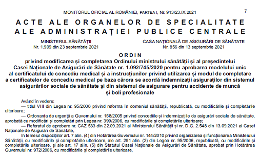 Stimati colegi, va informam pe aceasta cale ca, in Monitorul Oficial nr. 913 din 23 septembrie 2021, a fost publicat Ordinul Comun al MINISTERULUI SĂNĂTĂȚII nr. 1909 din 23 septembrie 2021 si al CASEI NAȚIONALE DE ASIGURĂRI DE SĂNĂTATE nr. 856 din 13 septembrie 2021 – privind modificarea și completarea Ordinului ministrului sănătății și al președintelui Casei Naționale de Asigurări de Sănătate nr. 1.092/745/2020 pentru aprobarea modelului unic al certificatului de concediu medical și a instrucțiunilor privind utilizarea și modul de completare a certificatelor de concediu medical pe baza cărora se acordă indemnizații asiguraților din sistemul asigurărilor sociale de sănătate și din sistemul de asigurare pentru accidente de muncă și boli profesionale.