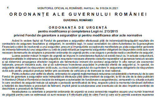 Stimati colegi, va informam pe aceasta cale ca, in Monitorul Oficial nr. 916 din 24 septembrie 2021, a fost publicata Ordonanță de urgență a Guvernului României nr. 102 din 22 Septembrie 2021 – pentru modificarea și completarea Legii nr. 213/2015 privind Fondul de garantare a asiguraților și pentru modificarea altor acte normative.