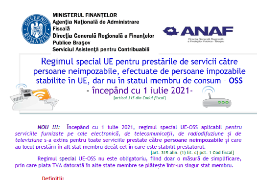 Va supunem atentiei un material oficial (8 pagini) – elaborat de DGRFP Brasov (institutie careia ii multumim pentru posibilitatea preluarii informatiilor) – ce prezinta sub forma de tabel si text, o serie de informatii cu privire la regimul special UE pentru prestările de servicii către persoanele neimpozabile, efectuate de persoanele impozabile stabilite in UE,dar nu în statul membru de consum-OSS – începând cu 1 iulie 2021 (material publicat in data de 30.08.2021).