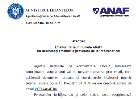 Agenţia Naţională de Administrare Fiscală informează contribuabilii asupra unui val de mesaje transmise prin email, care utilizează denumirea, precum și coordonatele institutiei (număr telefon, adresa poștală). ANAF precizeaza ca – nu are deschisă adresa adresa de email [email protected]