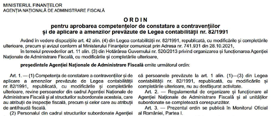 Cu intarziere, va informam pe aceasta cale ca, in Monitorul Oficial nr. 1057 din 4 noiembrie 2021, a fost publicat Ordinul președintelui ANAF nr. 1768 din din 2 noiembrie 2021 – pentru aprobarea competențelor de constatare a contravențiilor și de aplicare a amenzilor prevăzute de Legea contabilității nr. 82/1991 .