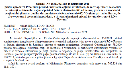 Cu întârziere va informam ca, in Monitorul Oficial nr. 1096 din 17 noiembrie 2021, a fost publicat Ordinul președintelui ANAF nr. 1831 din 15 noiembrie 2021 – pentru aprobarea Procedurii privind exercitarea opţiunii de utilizare, de către operatorii economici nerezidenţi, a sistemului naţional privind factura electronică RO e-Factura, precum şi a modelului, conţinutului şi instrucţiunilor de completare ale formularului (083) „Opţiune privind utilizarea, de către operatorii economici nerezidenţi, a sistemului naţional privind factura electronică RO e-Factura”.