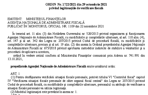Cu întârziere va informam ca, in Monitorul Oficial nr. 1109 din 22 noiembrie 2021, a fost publicat Ordinul președintelui ANAF nr. 1722 din 29 octombrie 2021 – privind privind legitimaţiile de verificare fiscală .