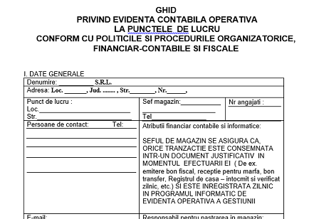 Va supunem atentiei un GHID util (13 pagini) – elaborat de colega noastră de pe grupul Contabili pe Facebook – Luminita Mocean (careia ii multumim pentru posibilitatea preluarii informatiilor si modelului ) – ce prezinta o serie de informatii privind procedura organizatorică si evidentă contabilă primară pentru punctele de lucru (material publicat in decembrie 2021).