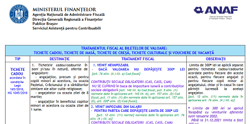 Va supunem atentiei un material oficial (3 pagini) – elaborat de DGRFP Brasov (institutie careia ii multumim pentru posibilitatea preluarii informatiilor) – ce prezinta o serie de informatii cu privire la tratamentul fiscal al biletelor de valoare (material publicat in data de 26.01.2022).